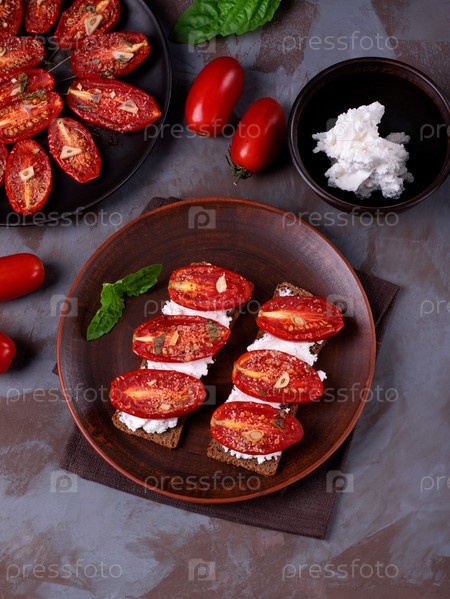 Брускетта с запеченными помидорами на сливочном сыре и ржаными хлебцами на глиняной тарелке. Вид сверху