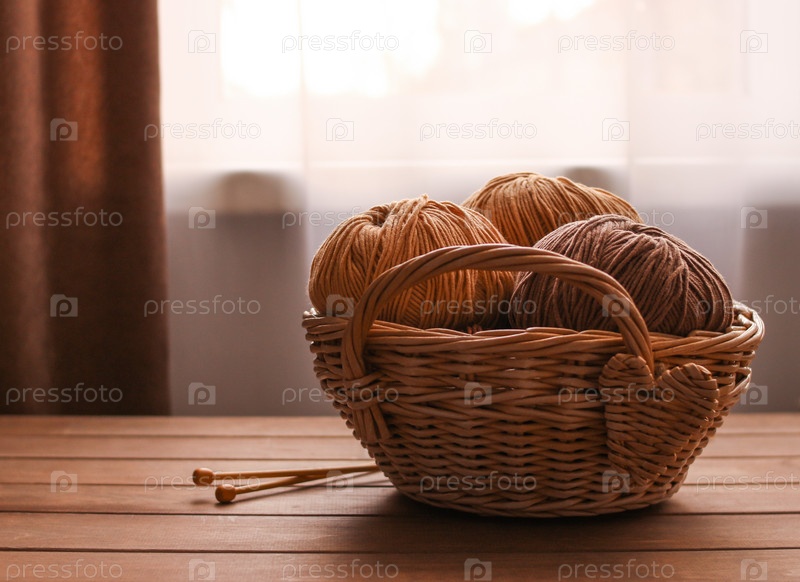 Домашняя уютная плетеная корзинка с пряжей и спицами на столе у окна. Концепция дня ремесел