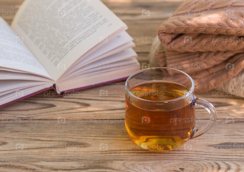 Чашка зеленого чая, свитер и открытая книга на деревянном столе. Понятие тепла и уюта