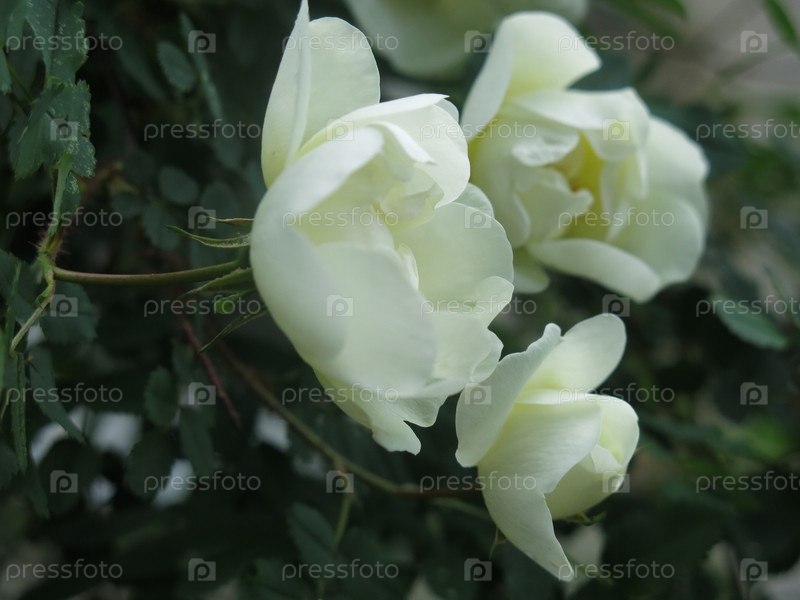 Белые цветки душистого шиповника на кусте