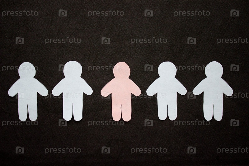 Силуэты пяти мужчин, выстроенные в ряд, вырезаны из бумаги. Между белыми мужчинами есть один розовый мужчина. На черном фоне