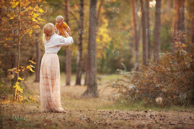Красивая мать держит своего ребенка. Мама любит своего сына. Семейное время на осенней природе. Копировать пространство на фоне