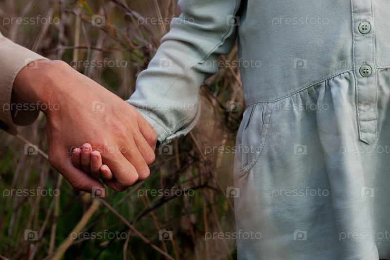 Закройте рука об руку, маленькая девочка держит папу за руку снаружи на природе. День отца, Натуральный цвет