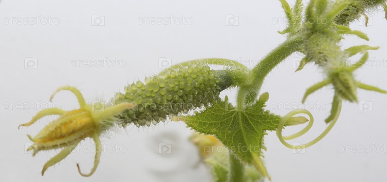 Молодой зеленый огурец с цветком на белом фоне