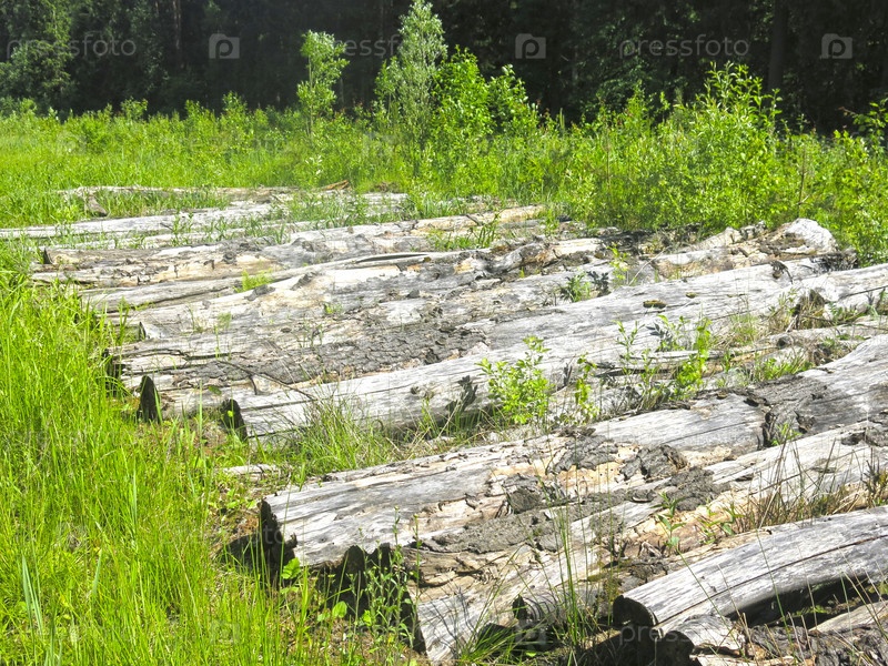 Старые сухие круглые бревна лежат в лесу