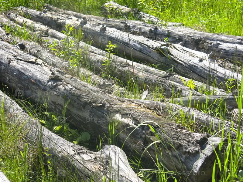 Старые сухие круглые бревна лежат в лесу