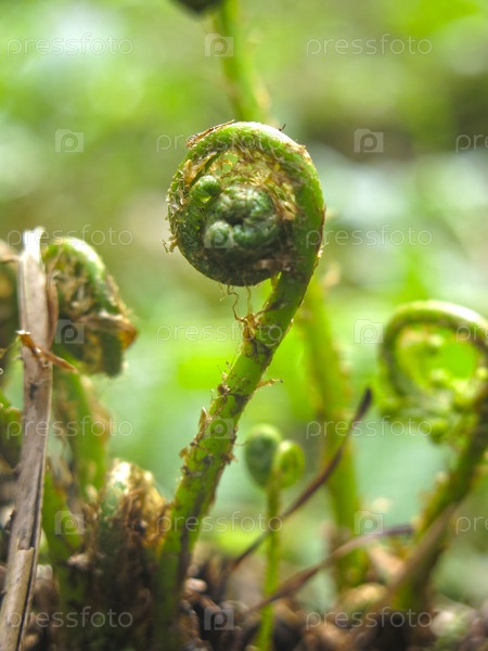 Молодые побеги лесного папоротника (Polypodiophyta) в виде крючка - древнейшего растения на Земле