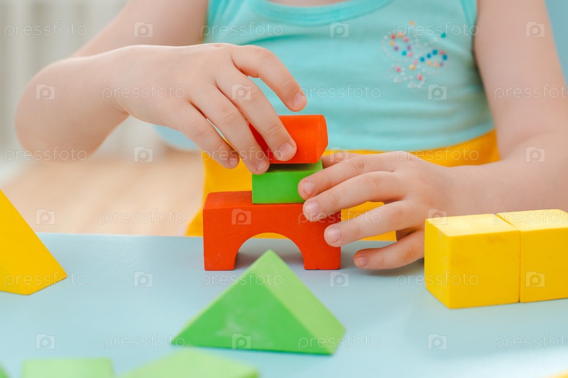 Маленькая девочка собирает деревянную неокрашенную пирамиду. Безопасные детские игрушки из натурального дерева