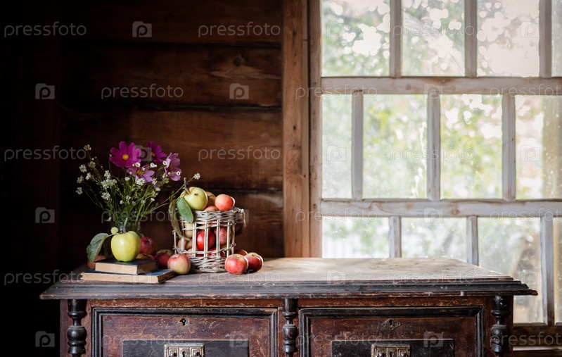 Свежий урожай спелых и здоровых фермерских яблок в стеклянной банке, в корзине. Натюрморт осенний деревенский у окна и старый комод на темном фоне