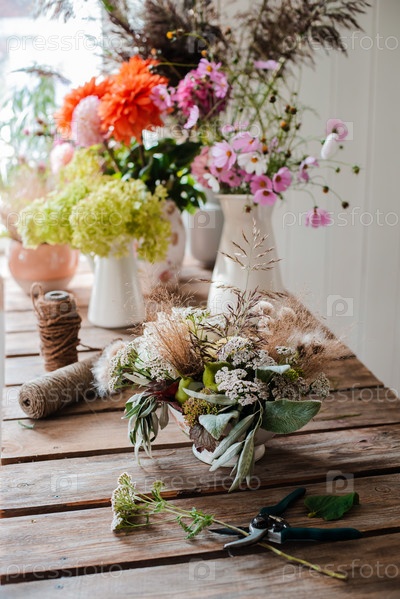 Женский профессиональный флорист готовит композицию из полевых цветов