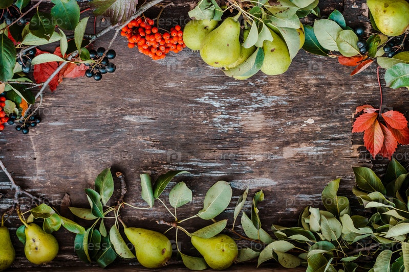 Красно-черная рябина с грушевыми ветвями и осенними листьями на текстурированной старой деревянной поверхности