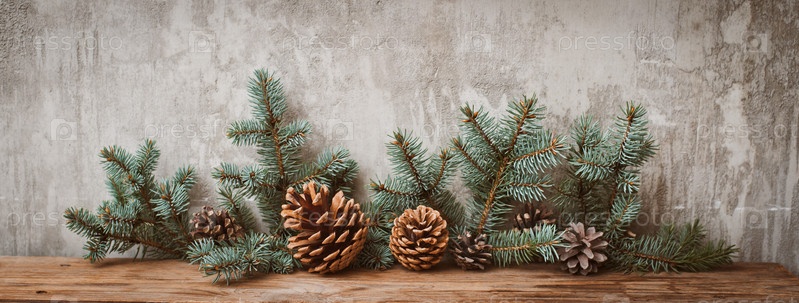 Ветки елки с шишками на темной деревянной доске у серой бетонной стены