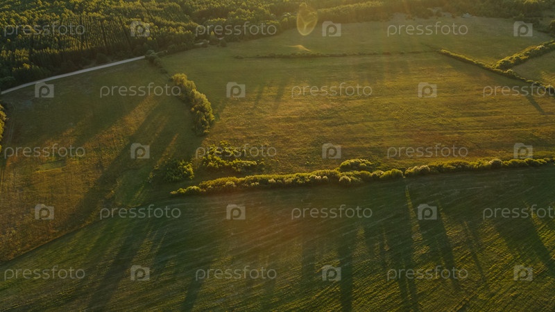 Сельский пейзаж на рассвете. Зеленые леса и поля в лучах восходящего солнца. Аэрофотосъемка