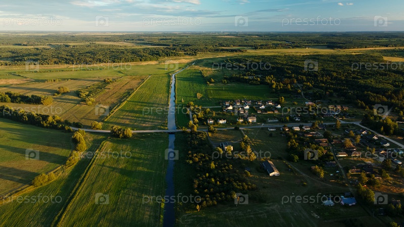 Сельский пейзаж на закате. Среди деревьев видны крыши домов. Аэрофотосъемка
