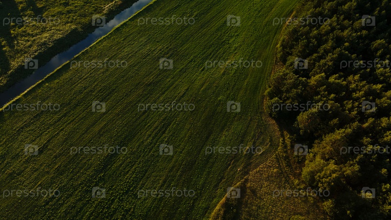 Сельский пейзаж. Зеленые леса и поля. Река течет. Аэрофотосъемка
