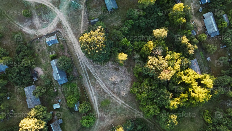 Сельский пейзаж на закате. Среди деревьев видны крыши домов. Аэрофотосъемка