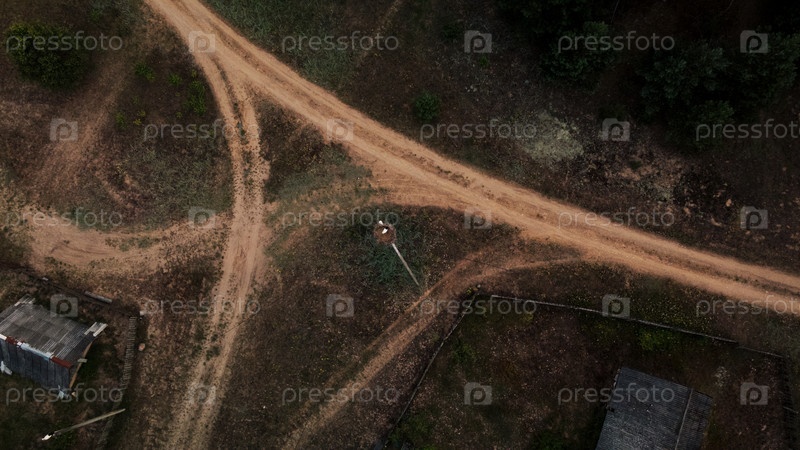 Перекресток грунтовых сельских дорог. В центре перекрестка гнездо с аистами. Аэрофотосъемка