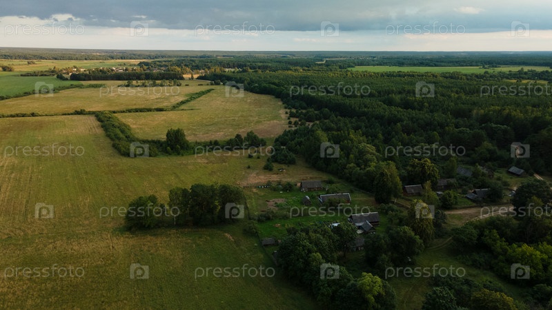 Сельский пейзаж на рассвете. Зеленые леса и поля в лучах восходящего солнца. Аэрофотосъемка