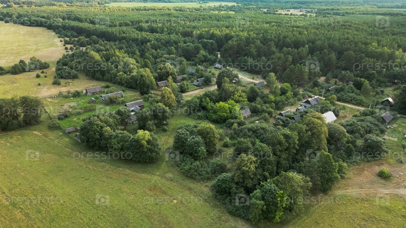 Сельский пейзаж на закате. Среди деревьев видны крыши домов. Аэрофотосъемка