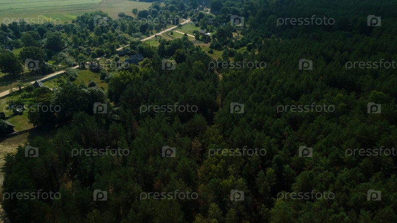 Сельский пейзаж на закате. Среди деревьев видны крыши домов. Аэрофотосъемка