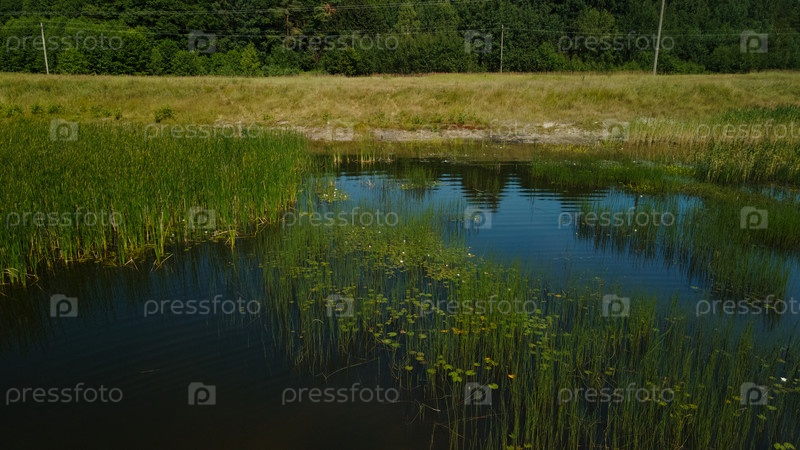 Сельский пейзаж. Зеленые леса и природный водоем. Аэрофотосъемка