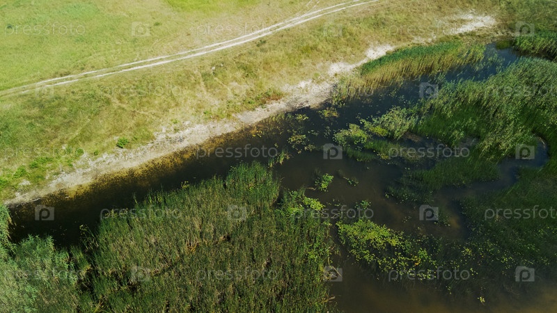 Полет над лесным озером. В воде растут камыши и кувшинки. Аэрофотосъемка