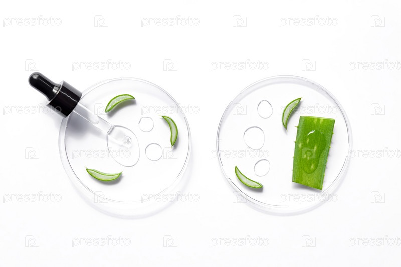 Концепция лаборатории натуральной косметики. Чашки Петри с косметическим гелем растения Алоэ Вера, пипетка-капельница с сывороткой на белом фоне, вид сверху