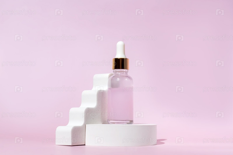 Антивозрастная коллагеновая сыворотка для лица в стеклянной бутылке на белом подиуме на розовом фоне с копией пространства. Натуральная органическая косметика. Макет для брендинга