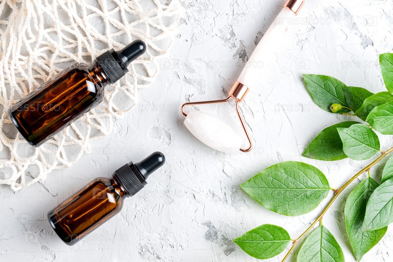 Красивая композиция из бутылок с сывороткой без бренда с пипетками и роликом для лица из кварцевого камня на бетонном фоне. Концепция антивозрастной косметики. Креативная модная косметика плоская планировка