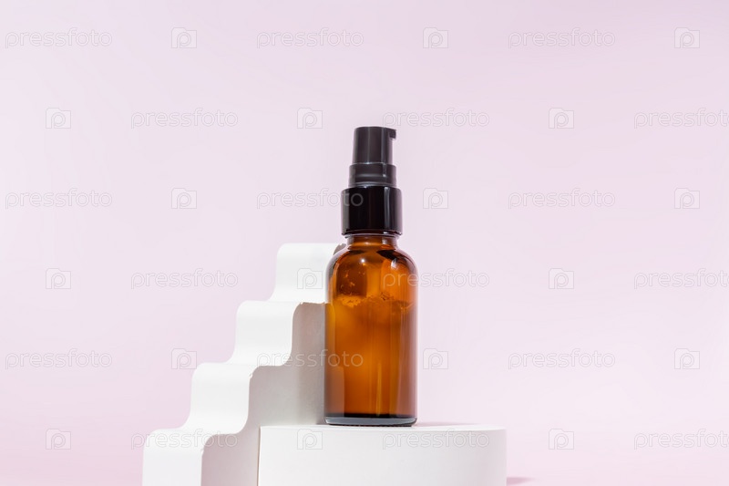 Помпезная бутылка из янтарного стекла с черной крышкой на подиуме на светло-розовом фоне. Средства по уходу за кожей, натуральная косметика. Концепция красоты для ухода за лицом и телом