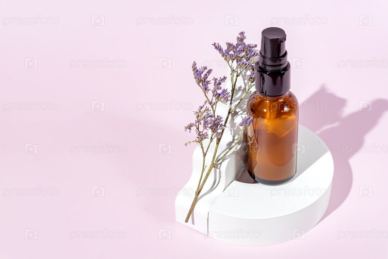 Бутылка из янтарного стекла с пышной крышкой на белых подиумах. Розовый фон. Макет контейнера с кремом или сывороткой для лица. Витрина для презентации средств по уходу за кожей