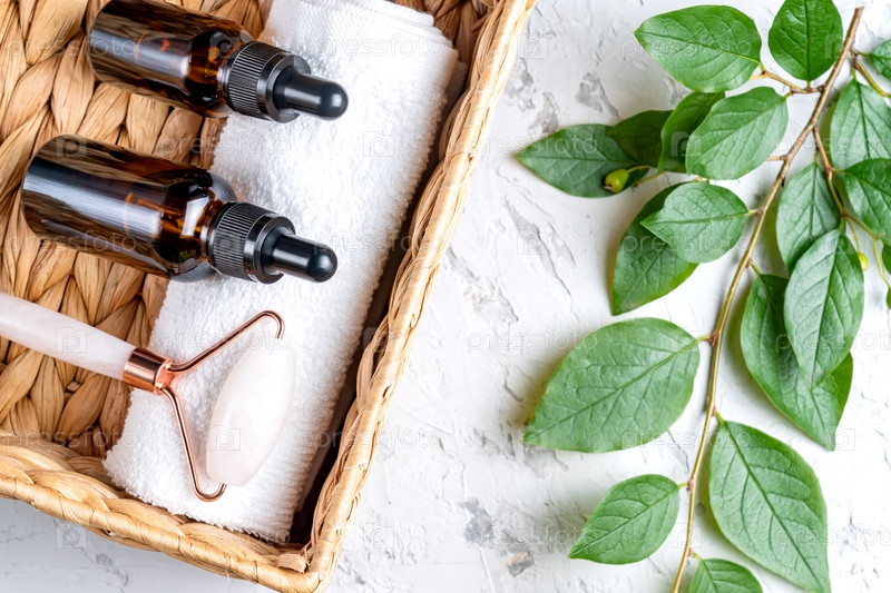 Янтарные флаконы с пипеткой-капельницей и лицевым кварцевым валиком в плетеной корзине. Бетонный фон с мягким дневным светом. Сыворотка по уходу за кожей или натуральная косметика эфирного масла. Концепция красоты для ухода за лицом