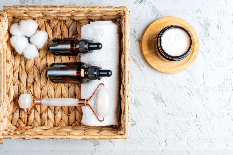 Вид сверху на небрендированные бутылки из темного стекла со средствами по уходу за кожей в эко-корзине. Ролик для массажа лица и хлопковый цветок. Набор для ухода за лицом для домашних процедур