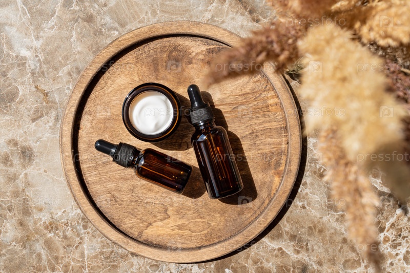 Набор косметических флаконов из янтарного стекла на деревянном подносе. флакон-капельница и баночка с кремом. Дизайн упаковки косметических средств по уходу за кожей для повседневной жизни