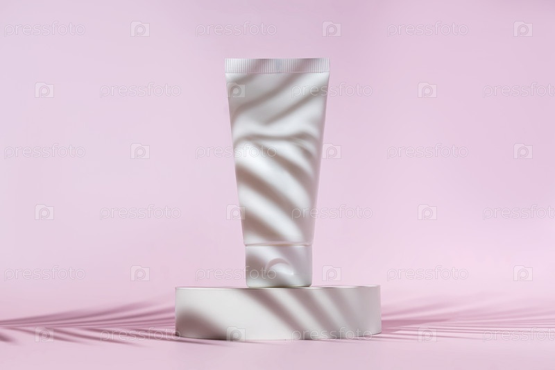 Макет белой пластиковой тубы для брендинга лекарств или косметики - крема, геля, ухода за кожей, зубной пасты. Контейнер для косметических бутылок на пастельно-розовом фоне. Минимализм