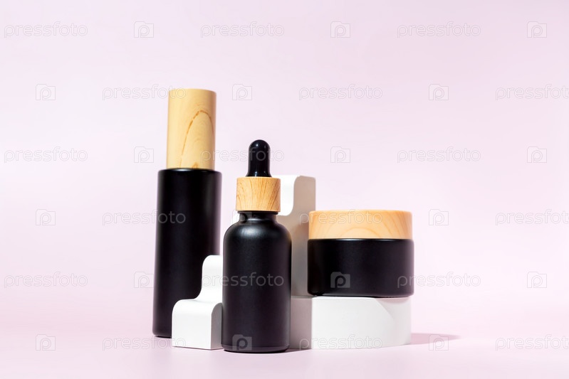 Набор флаконов косметики из черного матового стекла с бамбуковыми крышками на белом подиуме. Макет фона с бетонными геометрическими фигурами и пространством для копирования. Сцена с презентацией продукта