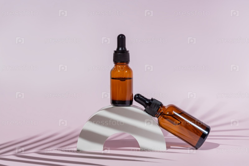 Масло для красоты лица в капельницах из темного стекла на розовом фоне с тенью тропической пальмы. Женский косметический аксессуар для макияжа. Макет, айдентика, пространство для копирования