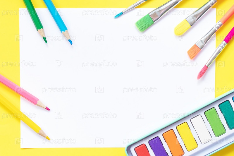Карандаши, кисти и краски на бумаге