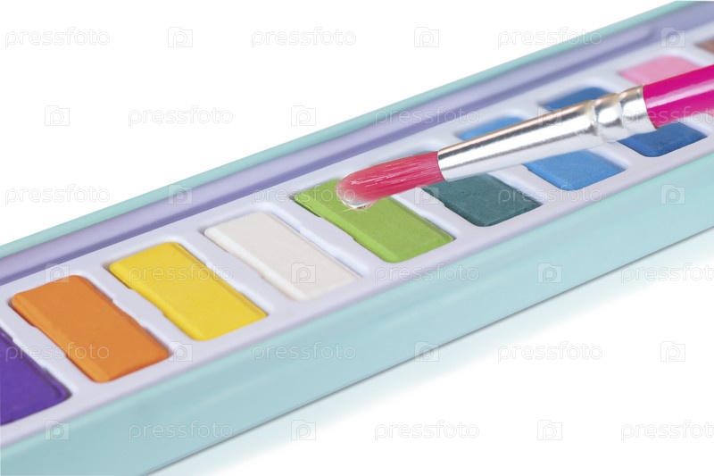 Набор акварельных красок расположен наискось, художественная розовая кисть с каплей воды на конце