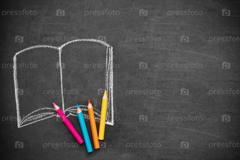 Расположение карандашей на черной школьной доске с книгой, нарисованной мелом