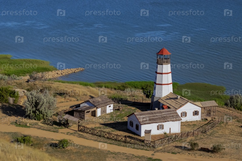 На берегу синего моря стоит старинный красно-белый маяк, рядом дом смотрителя маяка, амбар, причал из камней, дорога, трава, зелень