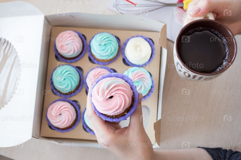 Кекс с розовым и голубым кремом в руках девушки на фоне коробки кексов