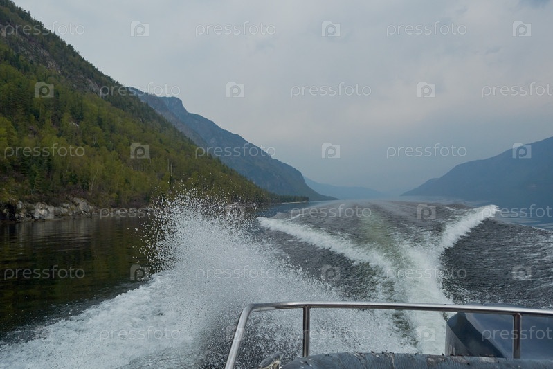 Живописный вид на Телецкое озеро, Алтай. Прогулка на лодке по озеру, вид на горы с лодки, волны в виде китового хвоста