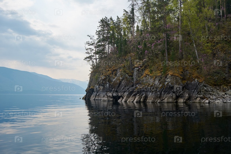Скалистый берег горного озера. Россия, Республика Алтай, Телецкое озеро, водная гладь, пасмурная погода