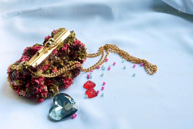 Сшитая вручную сумочка с золотой цепочкой на белом фоне со складками, бисером. сердце рядом с копией пространства