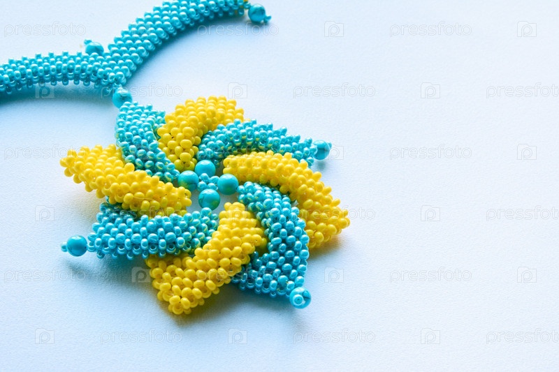Квадратная коса из желто-голубых бусин, на белом фоне, место для текста крупным планом