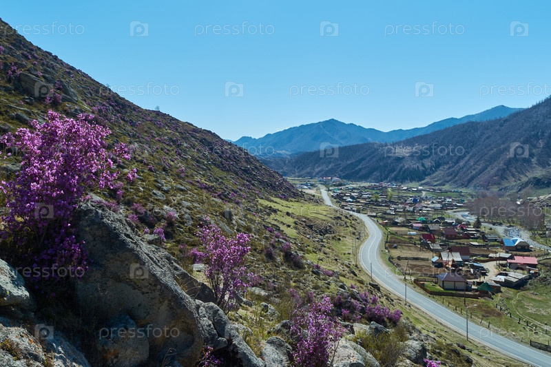 Сказочный весенний пейзаж, красивый вид с цветущими розовыми рододендронами на фоне алтайского села Купчеген и голубого неба. Цветущий маральник или розмарин в горах Алтая