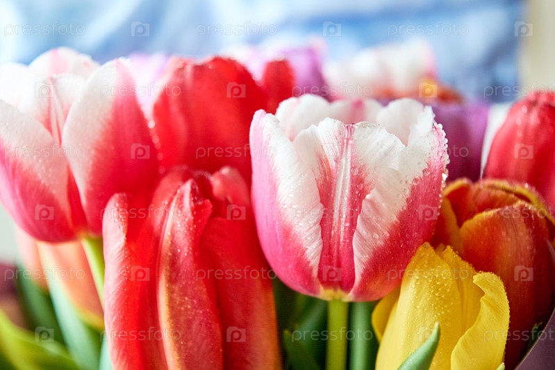 Тюльпаны с каплями воды - близкий букет к празднику 8 марта