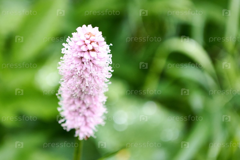 Большой план цветов красного бисторта, Persicaria bistorta 'Superba', весной