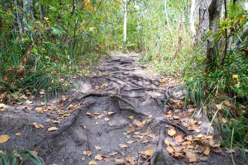 Лесная тропа с корнями и желтыми листьями. Узкая тропа через осенний лес, вертикальная композиция, низкий угол обзора